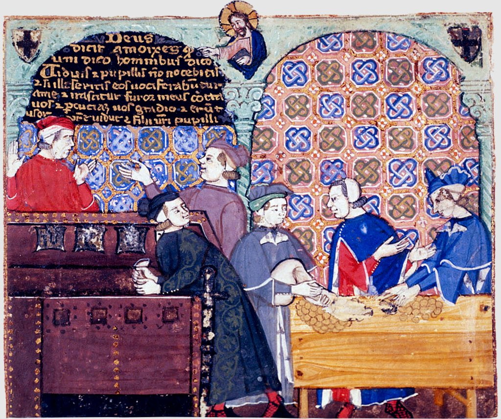 A 14th century manuscript depicting bankers in an Italian counting house.